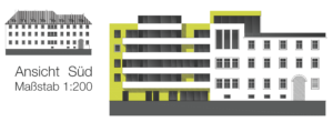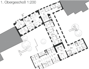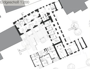 Kerngebäude mehreren Ausbauten der 60er Jahre und erschloss sich ein Hinterhaus aus der Gründerzeit. Ziel des Entwurfs war es, die über die Jahre gewachsenen Strukturen zu bereinigen, das Amtshaus auf einen Barrierefreien Standard umzurüsten und dabei die Aufenthaltsqualität zu steigern. Hinzu sollte Wohnraum für Starterfamilien neu geschaffen werden und das straßenseitige Erscheinungsbild erhalten bleiben.