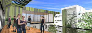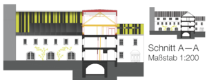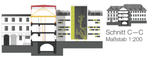 Dafür wurde im Erdgeschoß der Festsaal aufgelöst und in ein modernes Bürgerservicesenter umfunktioniert. Der Dachausbau der 60er Jahre wurde dient künftig als neuer Festsaal und kann nun, bedingt durch die optimierte Erschließung geteilt und unabhängig bespielt werden. Ein Flügel des Hinterhauses wurde zugunsten eines Neubaus geschliffen und kann durch die neuen Geschoßhöhen alle geforderten Wohnungen beherbergen wobei es gleichzeitig in den niveaugleichen Etagen als erweiterung der Büroflächen dient.